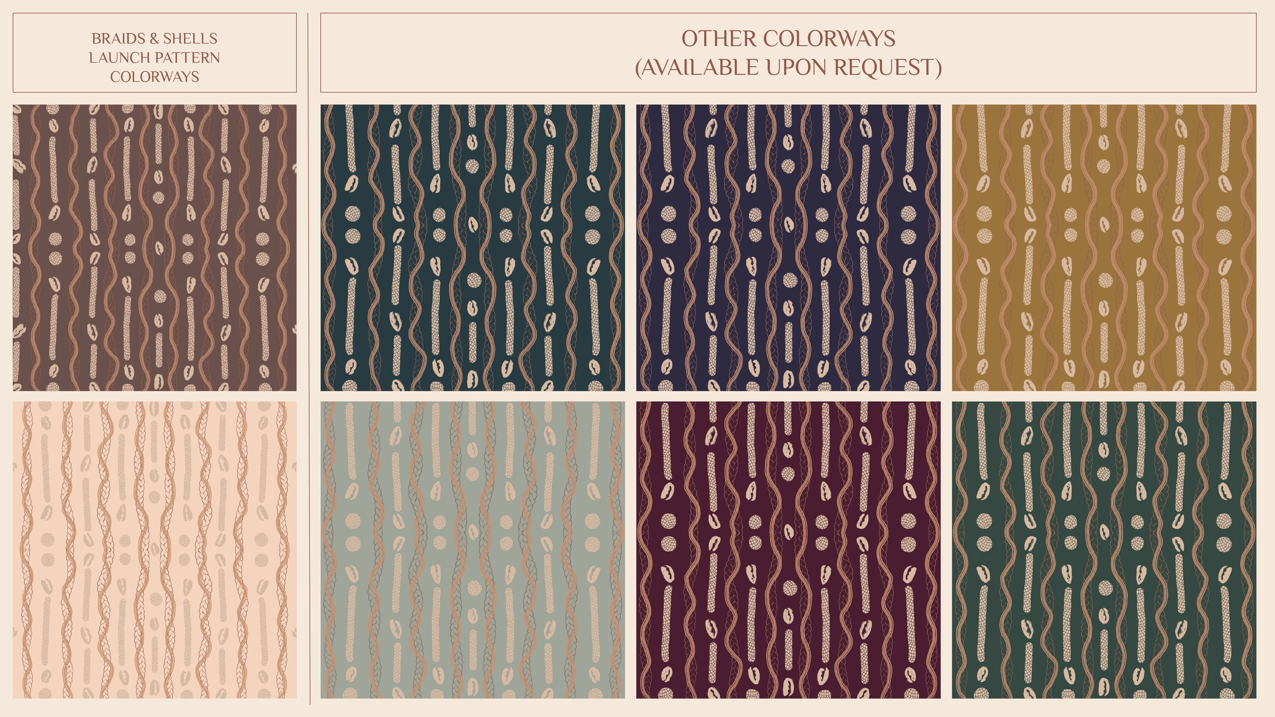 Each flowing line maps a different braiding pattern: cornrows, Ghana braids, the protective styles that carried coded messages along Underground Railroad routes. The cowrie shells scattered throughout aren't just decoration; they're currency, communication, connection to an ancestral home across waters. The earth tones ground us in soil while honoring global Black beauty traditions.